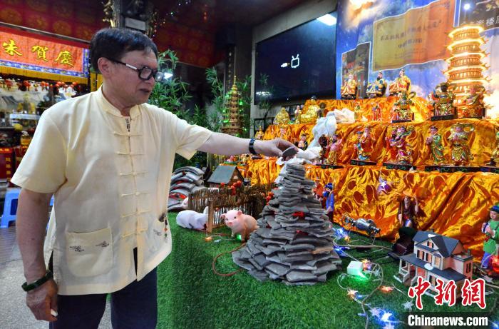 9月13日,福州裴仙宫开始展示福州特有的中秋“摆塔”民俗文化,福州裴仙信俗非物质文化遗产传承人、裴仙宫管委会主任陈锦丰向参观者讲解福州中秋“摆塔”民俗的历史。 中新社记者 吕明 摄