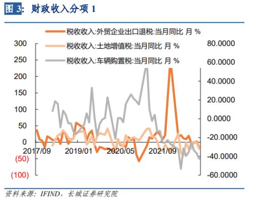另外,外贸企业出口退税、车辆购置税、土地增值税等是主要拖累项,同比增速分别为-16.0%、-42.7%和-20.2%,且这三者同比增速都是与前值相比继续下滑的,这些数据与当下出口的不济、汽车销售的下降以及房地产销售的低迷相映衬。
